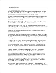 The Inuvik Declaration, 1996. Declaration from the Ministerial meeting of the Arctic Environmental Protection Strategy (AEPS)held in Inuvik, Canada.