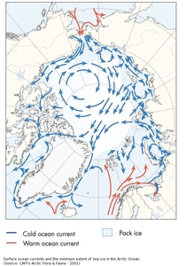 Arctic Council , Conservation of Arctic Flora and Fauna Working Group (2001) CAFF Map No.43 - Surface ocean currents and the minimum extent of sea ice in the Arctic. [Image]