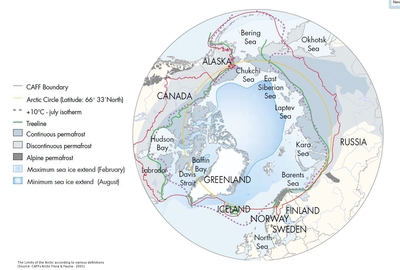 Arctic Council , Conservation of Arctic Flora and Fauna Working Group (2001) CAFF Map No.46 - The limits of the Arctic according to various definitions. [Image]