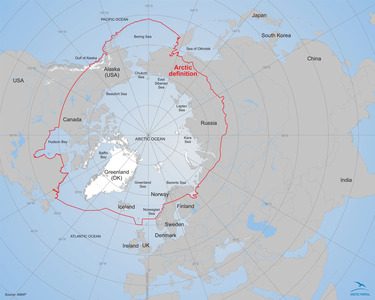 A map of the Arctic with a definition. There are many definitions but this one if of the Arctic Monitoring and Assessment Programme (AMAP) "area". It essentially includes the terrestrial and marine areas north of the Arctic Circle (66°32´N), and north of 62°N in Asia and 60°N in North America, modified to include the marine areas north of the Aleutian chain, Hudson Bay, and parts of the North Atlantic Ocean including the Labrador Sea.