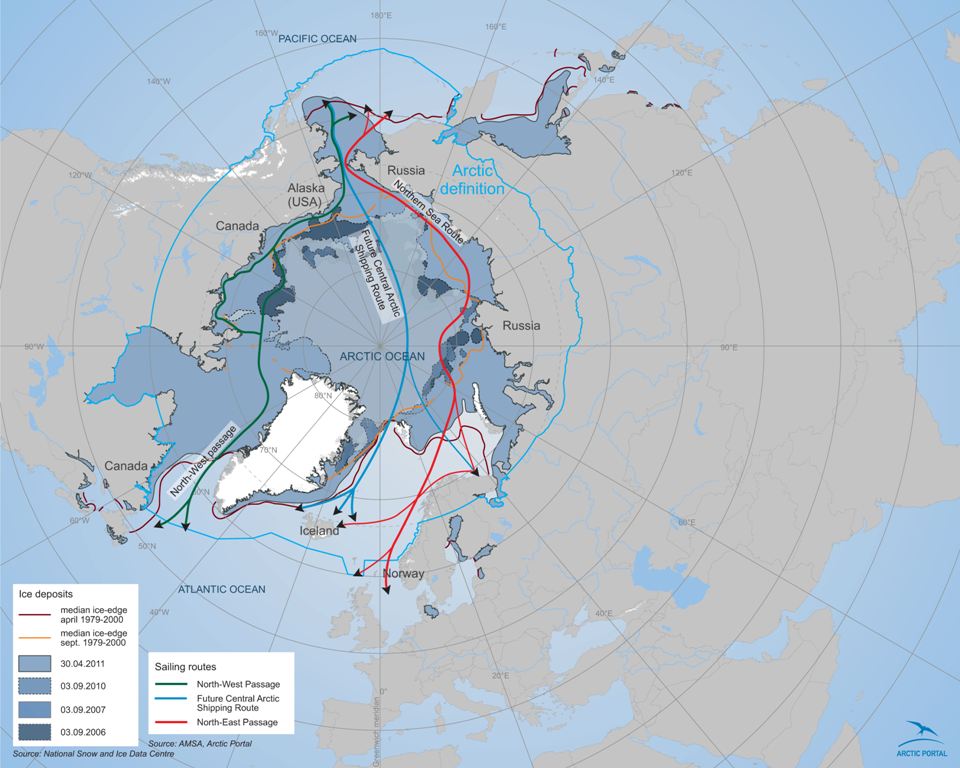 The map shows the median ice-edge in the Arctic in april and september from 1979 to 2000, with the three Arctic sailing routes. It also displays the ice deposit in 2006. 2007, 2010 and 2011. The ice data source is the National Snow and Ice Data Centre, NSIDC and the sailing routes data sources are the Arctic Portal and AMSA.