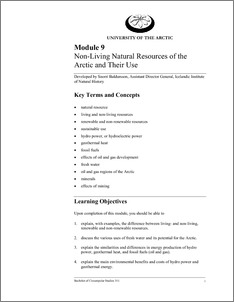 The Arctic is rich in natural resources: living and non-living, renewable and non-renewable. Human life and prosperity in the Arctic is dependent on the use of these resources, be it for sustenance consumption, export, or trade for other goods. Use of natural resources will always have some effects on the environment. Use of a non-renewable resource is fundamentally unsustainable because the resource will eventually be depleted. In order to be sustainable, the use of a renewable resource must harvest less than what is added through growth or recycling. The natural resources of the Arctic and their use will be discussed in this module as well as in Modules 10 and 11. In this module, we will explore non-living resources—water, oil and gas, and minerals—and their use.