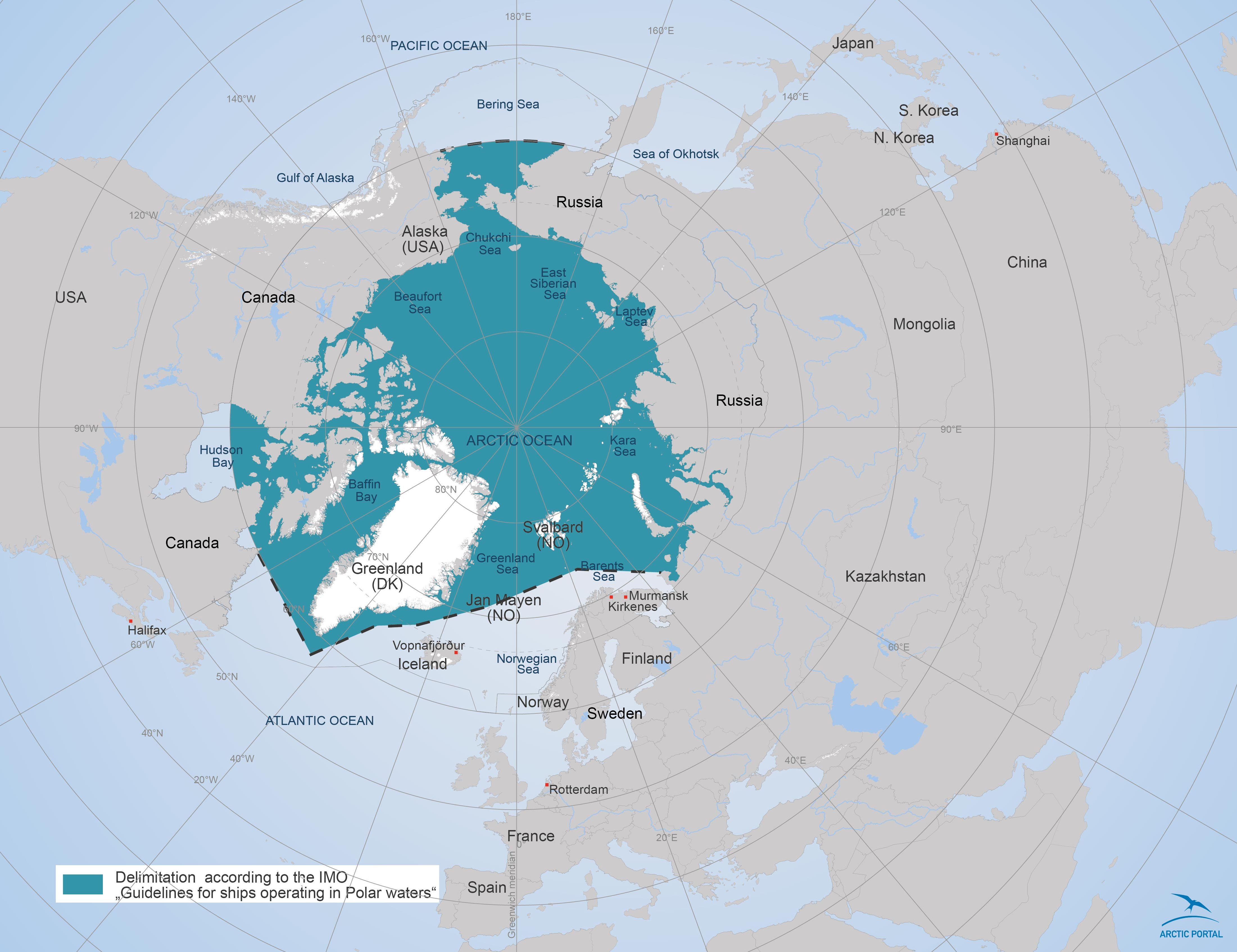 The map illustrates the area within the Arctic sea regulated by the IMO "Guidelines for Ships operating in Polar Waters"