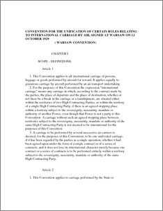 Unspecified Convention for the Unification of Certain Rules Relating to International Carriage by Air, signed at Warsaw, 12 October 1929 ( Warsaw Convention). Documentation. International Civil Aviation Organization.