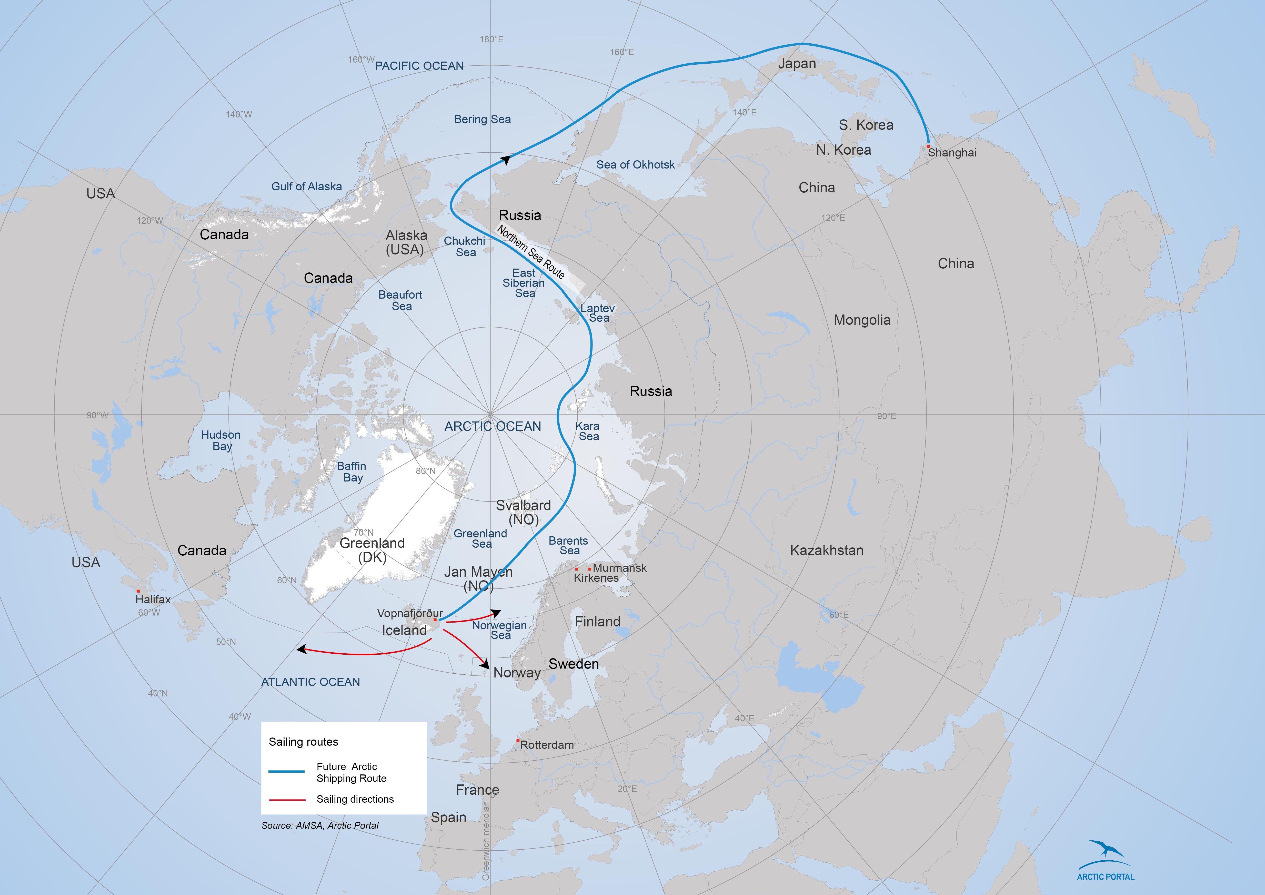 The maps shows possible sailing directions from future Arctic hub, located in the East Coast of Iceland, Finnafjörður, where the depth steeply goes down to over 70m and the length of harbour can surpass 10km with the industrial area of 1300 hectars of flat land.