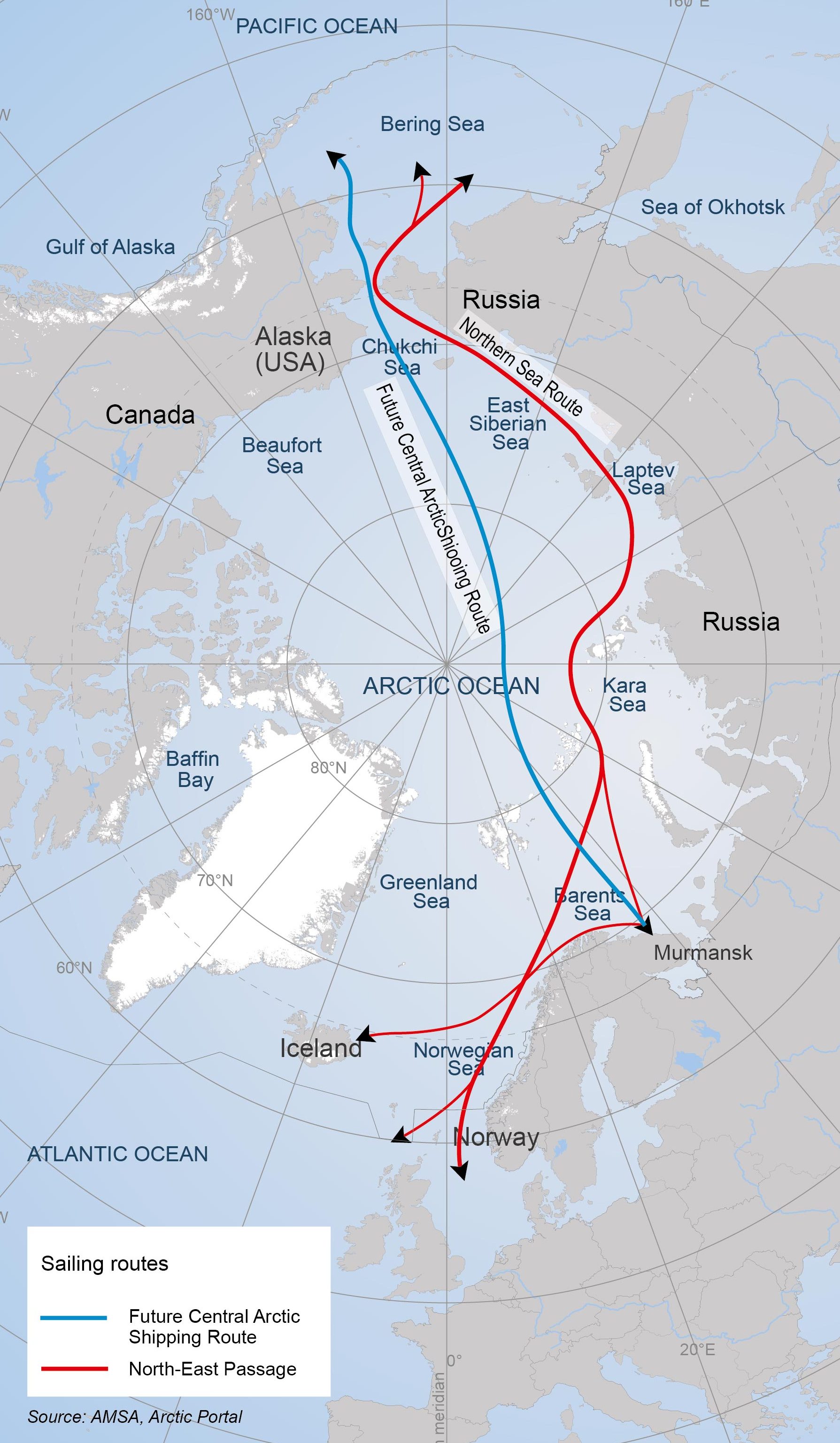 The map shows sailing directions from Murmansk Commercial Sea Port, the biggest Arctic shipping hub.