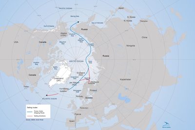 The map shows sailing directions from the Norwegian Arctic shipping hub, Kirkenes.