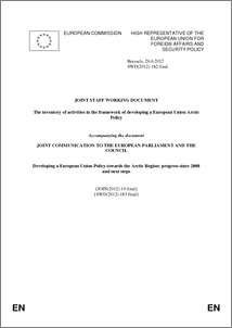 Accompanying the document Joint communication: Developing a European Union Policy towards the Arctic Region: progress since 2008 and next steps (http://library.arcticportal.org/1698/) This staff working document accompanies the Joint Communication to the European Parliament and the Council on Developing a European Union Policy towards the Arctic Region: progress since 2008 and next steps. The purpose of the staff document is to give detailed information about the progress outlined since the Communication of 20 November 2008 on ‘The European Union and the Arctic Region’. It covers activities undertaken by the Commission services, the relevant European agencies and the European External Action Service (EEAS) on the proposals set out in the 2008 Communication as addressed under the guidance of the 2009 Council Conclusions and the 2011 European Parliament Resolution, in consultation with the EU Member States and in dialogue with the other Arctic states and other Arctic stakeholders.