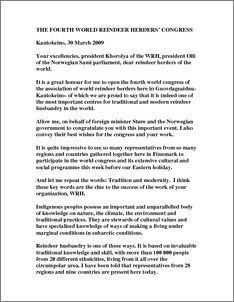 It is a great honour for me to open the fourth world congress of the association of world reindeer herders here in Guovdageaidnu- Kautokeino- of which we are proud to say that it is indeed one of the most important centres for traditional and modern reindeer husbandry in the world. Allow me, on behalf of foreign minister Støre and the Norwegian government to congratulate you with this important event. I also convey their best wishes for the congress and your work. It is quite impressive to see so many representatives from so many regions and countries gathered together here in Finnmark to participate in the world congress and its extensive cultural and social programme this week before our Eastern holiday. And let me repeat the words: Tradition and modernity. I think these key words are the clue to the success of the work of your organization, WRH.