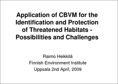 Heikkilä, Raimo (2009) Finnish Environment Application of CBVM for Institute SYKE, Joensuu the Identification and Protection of Threatened Habitats - Possibilities and Challenges. In: cfg, Uppsala. (Unpublished)