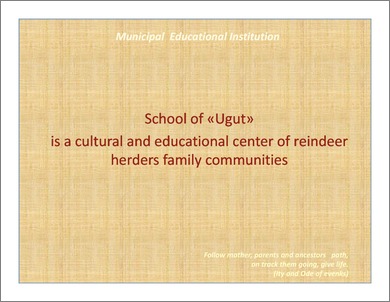 Enokhova, Svetlana (2009) School of «Ugut» is a cultural and educational center of reindeer herders family communities. In: IV World Reindeer Herders Congress, Kautokeino / Guovdageaidnu.