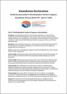 On the Occasion of the 4th World Reindeer Herders’ Congress Kautokeino, Norway, March 30th - April 3rd 2009, this document is the Kautokeino Declaration and outlines the priorities, challenges and concerns for WRH over the next four years