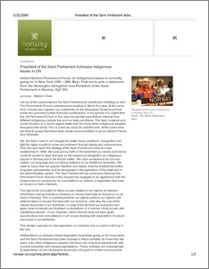 United Nations Permanent Forum on Indigenous Issues is currently going on in New York (18th – 29th May). First out to give a statement from the Norwegian delegation was President of the Sami Parliament in Norway, Egil Olli. 20/05/2009 :: Madam Chair, Let me at the outset express the Sami Parliaments satisfaction of letting us host The Permanents Forums presessional meeting in March this year. At the same time I should also express our satisfaction to the Norwegian Government that made this possible by their financial contributions. In my opinion it is urgent that the UN Permanent Forum in this way may get the possibility to observe how different Indigenous people live and our lively conditions. The Sami material and social situation is in some regard better than for many other indigenous peoples throughout the world. This is a fact we could be satisfied with. At the same time, we have to accept that these facts create responsibilities to act on behalf of those less fortunate. We, the Sami, have in our struggle for better living conditions, recognition and fight for rights sought to solve our problems through dialog and compromises. This has also been the strategy of the Sami Parliament science it was established in 1989. We have put our faith in the belief that our needs and claims could be solved in ways that give us the necessary recognition as indigenous people in Norway and in the Nordic states. We claim acceptance for our own culture, our language and our strong relations to our traditional territories. We state as basic that our special interests and needs shall be established within long-term perspectives and be recognized in the legislation of the state and in the administrative system. The Sami Parliament has previously informed the Permanent Forum that we in this respect has engaged in an agreement with the Government on procedures for consultations on actions or legislation that have an impact on Sami interests.