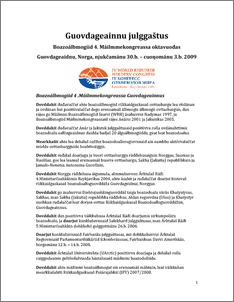 World Reindeer Herders' Association, - (2009) Guovdageainnu julggaštus Boazoálbmogiid 4. Máilmmekongreassa oktavuođas Guovdageaidnu, Norga, njukčamánu 30.b. – cuoŋománu 3.b. 2009. Documentation. Association of World Reindeer Herders, Kautokeino / Guovdageadnu, Norway.