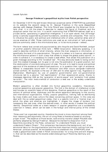 In this article, Laszek Sykulski explains the above mentioned concepts in his argument that the American administration has manufactured a number of myths on Polish geopolitics. The writing is a respond to the writings of Dr. George Friedman where his point of view criticized. The author ends the article by underlining the popular myths and explain the geopolitical status of Poland with more realistic approach.en